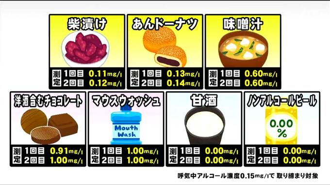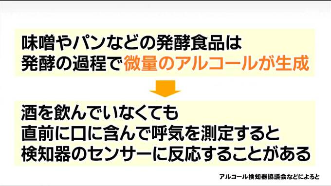 アルコール検知器メーカーなどで作るアルコール検知器協議会などによりますと、味噌やパンなどの発酵食品は、発酵の過程で微量のアルコールが生成されることがあり、酒を飲んでいなくても直前に口に含んで呼気を測定すると検知器のセンサーに反応することがあるということです。