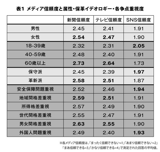 本調査では、新聞・テレビ・SNSの政治情報の各信頼度について、「まったく信頼できない=1」「あまり信頼できない=2」「まあ信頼できる=3」「かなり信頼できる=4」から1つを選んで回答してもらっている。表1に、性別・年代・保守派/革新派・各争点を重視する人別に、3つのメディアに対する信頼度の平均値を示した。