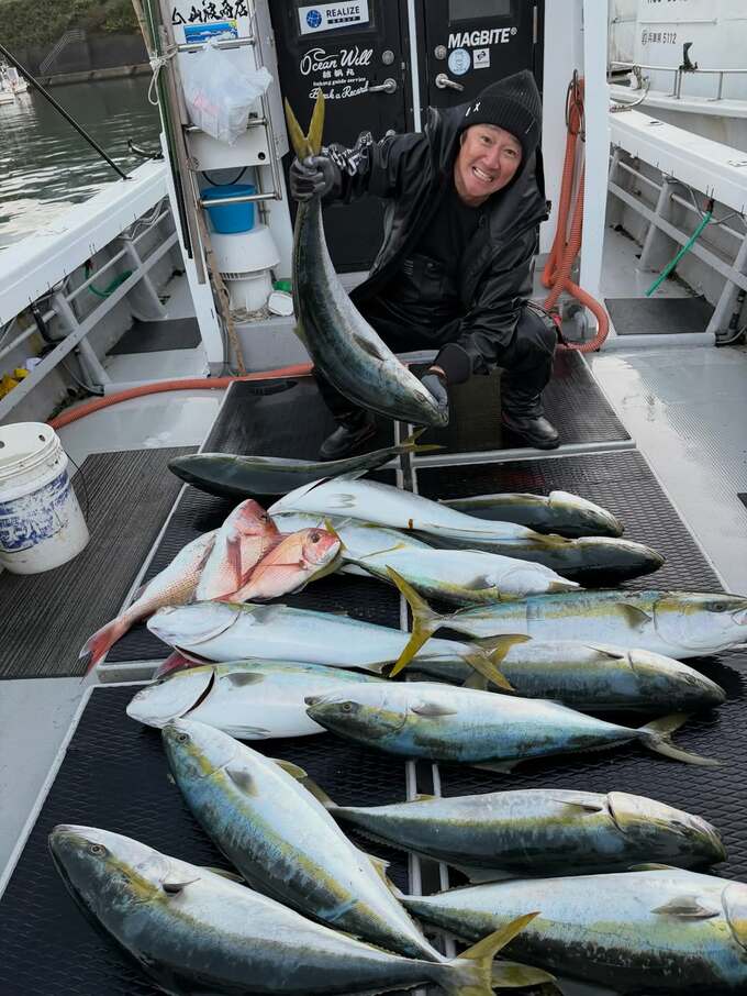 近藤さんは「ブリブリいわしたったぜ〜!」とツッパリ調で、釣り船の甲板で大きなブリを掲げた写真を投稿。近藤さんの前には、まさに “大漁” となったブリやハマチ、鯛などがびっしりと並んでいます。