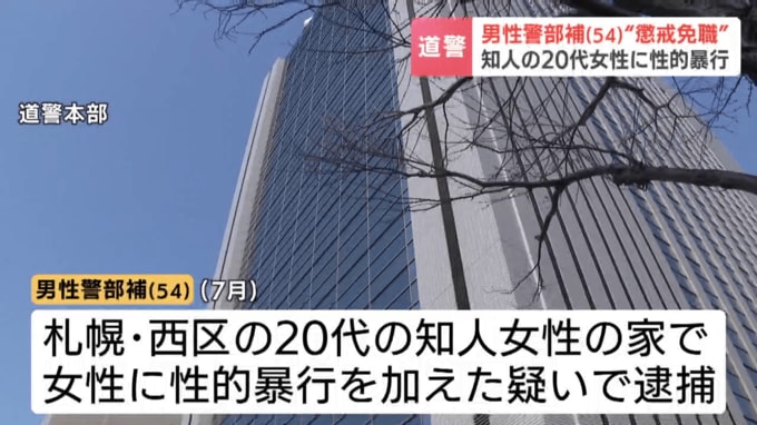 男性警部補は7月、札幌市西区に住む20代の知人女性の家で女性に性的暴行を加えた疑いで逮捕されました。
