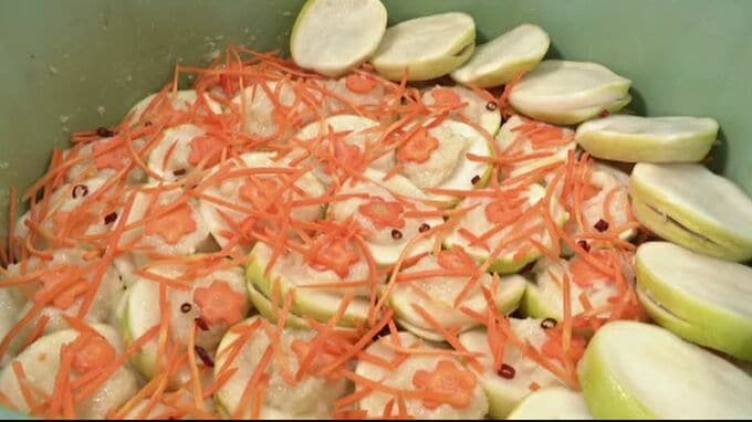 工場では、1日に1000枚から2000枚を漬け込むということで、20日は従業員がブリを挟んだカブを桶の中に丁寧に並べていきました。
