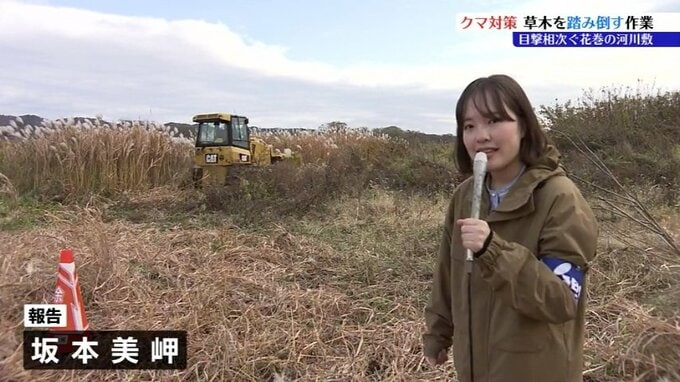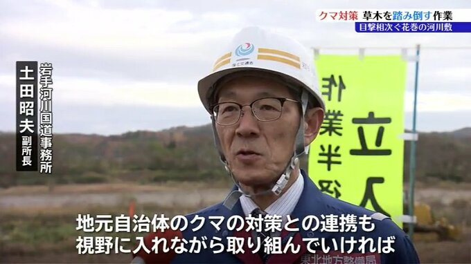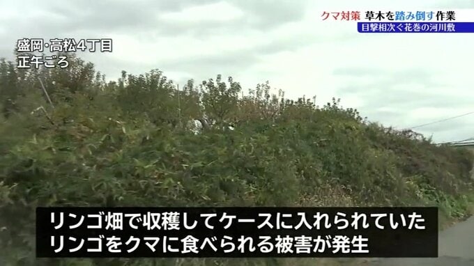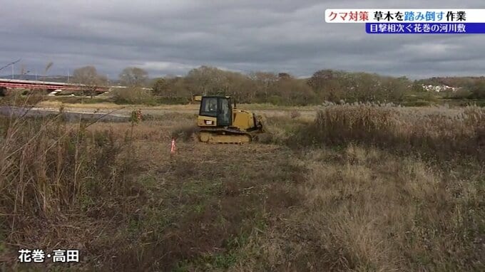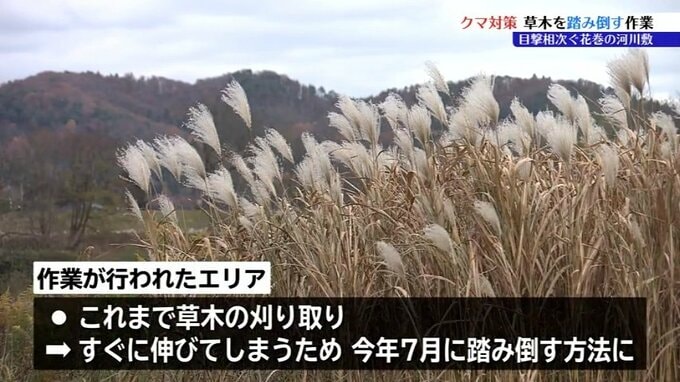 岩手県内でクマ被害が相次いでいることを受けて、花巻市で20日クマの隠れ場所になりやすい河川敷の草木を踏み倒す作業が行われました。