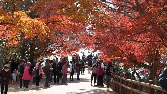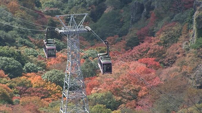 真っ赤なモミジに黄色く色づいたカエデ。日本三大渓谷美の1つ寒霞渓は、香川県内有数の紅葉の名所としても知られています。山頂と麓を結ぶロープウェイからは、赤や黄色など渓谷全体に広がる紅葉のグラデーションが一望できます。きょう(20日)も、国の内外から多くの人が訪れ、目の前に広がる絶景を堪能していました。