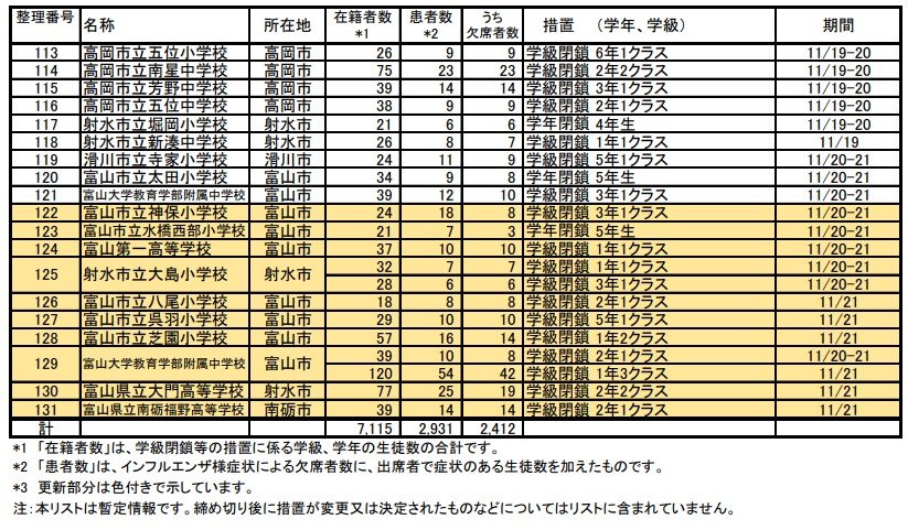 富山県内インフルエンザ警報レベルで小学校などで閉鎖相次ぎ計20校 過去最速の発表で県は予防徹底呼びかけ チューリップテレビ 2025年11月20日(木) 17:41 国内 暮らし・マネー 富山県内の学年・学級閉鎖の状況