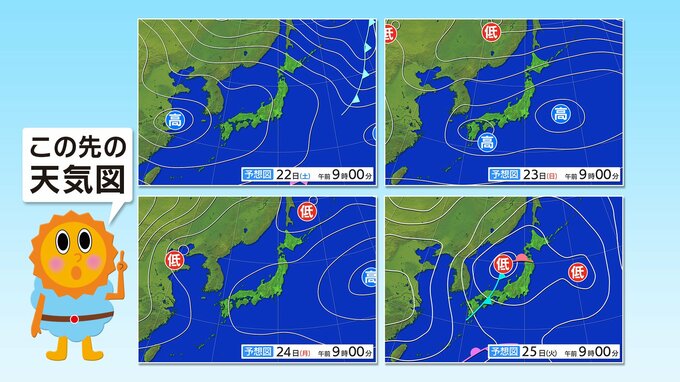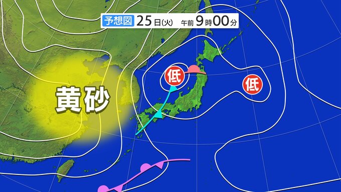 25日(火)には前線を伴った「低気圧」が、本州を通過します。この前線の後ろには「黄砂」控えていて、雨のあと、日本に流れ込むおそれがあります。