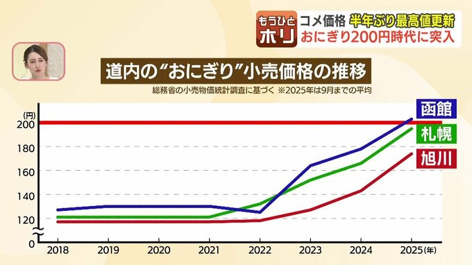 おにぎり1個あたりの平均価格は、この5年で大きく上昇。函館では今年の平均価格で200円台に突入。札幌も200円に迫る勢いです。