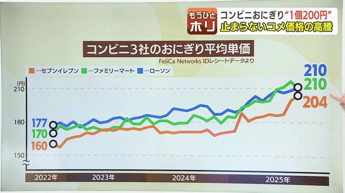 大手コンビニエンスストアの価格も見てみましょう。高級路線のおにぎりなど、各社の商品ラインナップによっても変わりますが…3年前は、おにぎり1個=160円から170円台でしたが徐々に価格が上がり、ことし6月以降、各社200円を超えています。