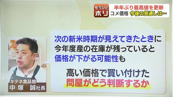 コメの小売業者などでつくる団体は、新米の収穫量が高水準になる見通しであることから、向こう3か月の価格の見通しとして値下がりする先安感が強まるとしていますが、キテネ食品館の中塚社長はこんな話をしています。