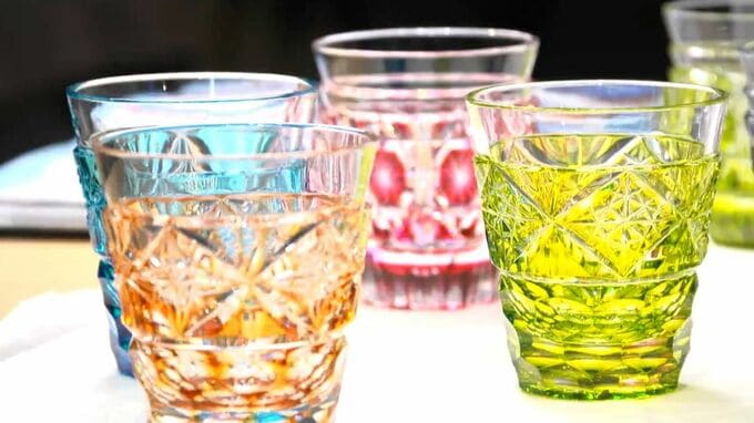 繊細なデザインの薩摩切子に。美しい木目とツヤの屋久杉。