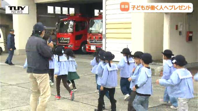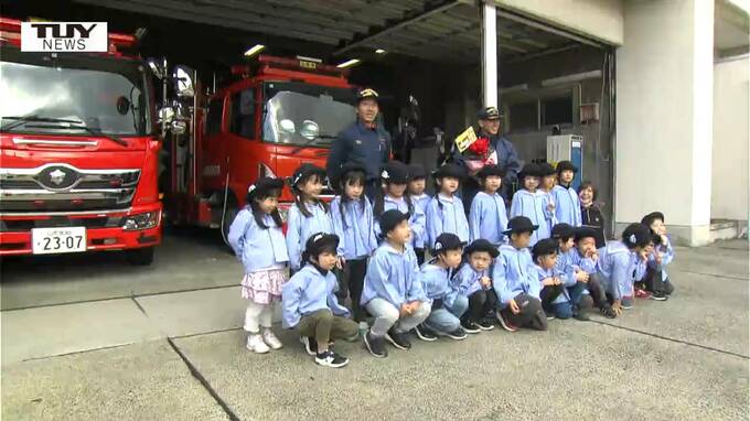 佐藤真優アナウンサー「最後の訪問先は、町の安全を守る消防署です。園児のみんな大好きな働く車に興味津々です」