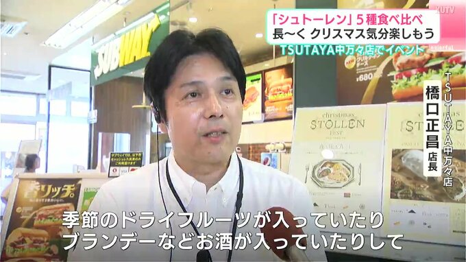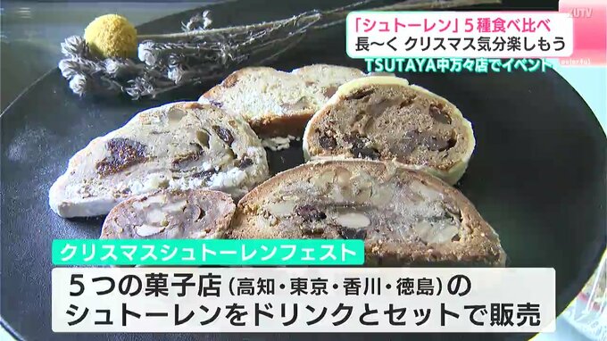 20日から高知市のTSUTAYA中万々店で始まったのは、「クリスマスシュトーレンフェスト」です。高知・東京・香川・徳島にある5店舗の菓子店のシュトーレンをドリンクとセットで販売しています。(※販売価格2000円・イートインのみ・売り切れ次第終了)