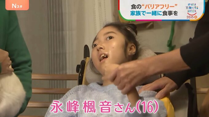 高校1年生の永峰楓音さん(16)。産まれてすぐに脳の病気を発症し、食べ物を上手に飲み込めない「摂食嚥下障害」があります。