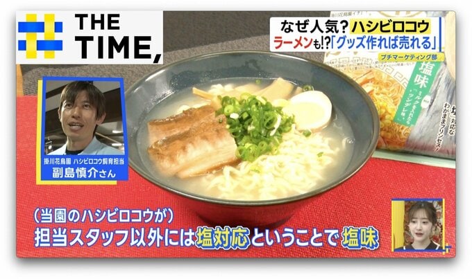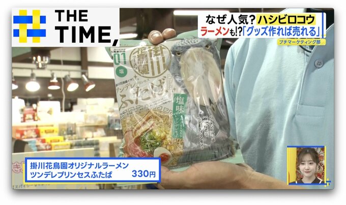 ぬいぐるみだけでも6種類以上という充実ぶりで、特に人気なのは、ふたばが袋に大きくプリントされた「掛川花鳥園オリジナルラーメン ツンデレプリンセスふたば」(330円)。