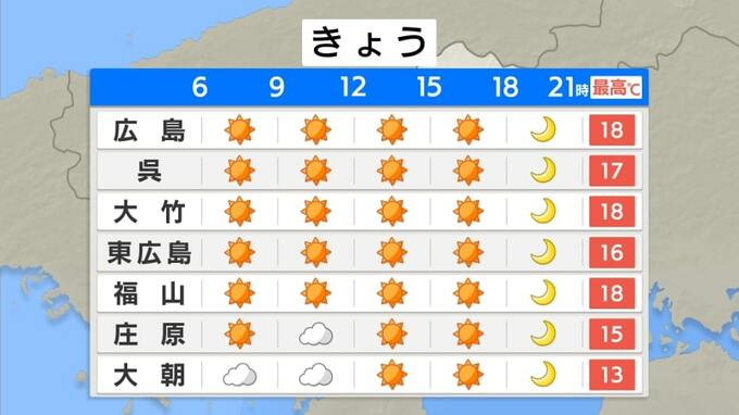 けさ(21日朝)の広島県内は、南部ではよく晴れていますが、北部では高度の低い雲が広がりやすくなっていて、霧がかっている所があります。車の運転の際はご注意ください。最低気温は、広島市中区は6.2℃ 大竹で6.6℃など、今季一番の冷え込みになりました。北部や内陸部ではきのうの朝と比べると2℃ほど高いですが、けさも冬日の地点がありました。