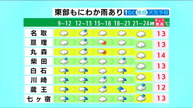 東部でも昼前後を中心ににわか雨がありそうなので、外出の際は雨具を持参することをお勧めします。