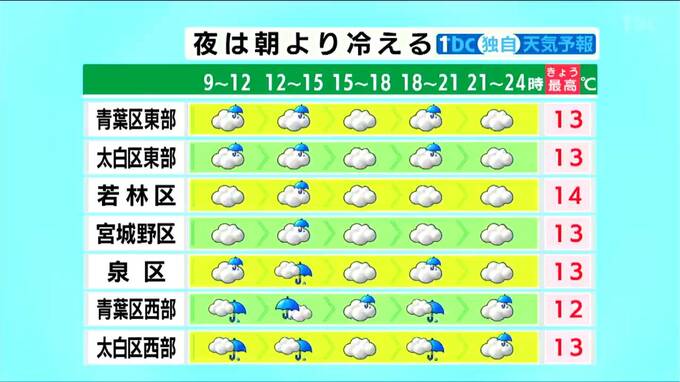 仙台の最高気温は、13℃前後で平年並となる見込みです。昨日と同じくらいの気温ですが、今日は日差しが弱くなるため、昨日よりも空気が冷たく感じられそうです。気温があまり大きくは上がらないため、暖かい服装で外出することをお勧めします。