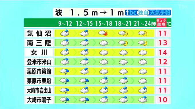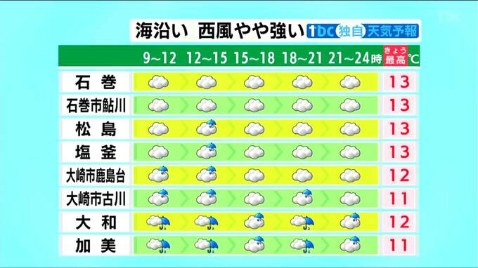 石巻から気仙沼にかけての沿岸部では、海上を中心に南西の風がやや強く吹く見込みです。陸上でも石巻周辺は午後に10m近く吹く可能性があるため、注意が必要です。気仙沼から鳴子にかけても、この後西部を中心に雨が降ったり止んだりする状況が続くでしょう。