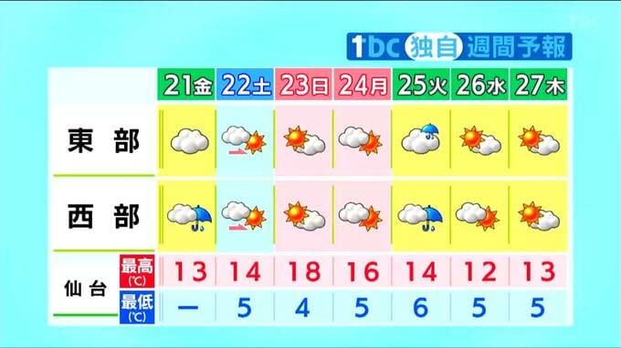21日の宮城県は、この時期としては比較的暖かな朝を迎えました。しかし、この暖かさは天気が崩れる前触れでした。日本海から近づく寒冷前線の影響で、県内では西部を中心に雨の一日となる見込みです。