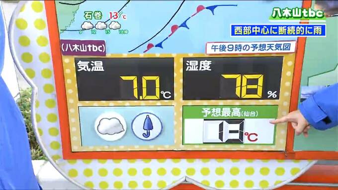 仙台市内を含む東部では、この後西部で雨が降ったり止んだりする状況となり、市の中心部でも昼前後はにわか雨がある見込みです。夜になると朝に比べて少し冷えてくるでしょう。