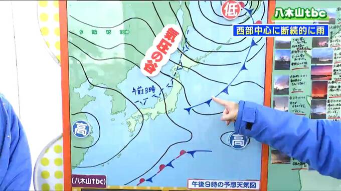 天気図を見ると、日本海から寒冷前線が近づいており、昼前後に県内を通過して東に抜けていく見込みです。前線通過後も上空に気圧の谷が残るため、特に西部では一日を通して雨が降りやすい状態が続きます。