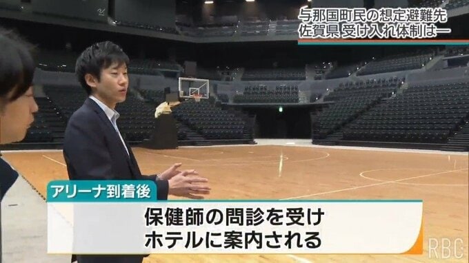 与那国島の住民はまず、航空機で1240キロあまり離れた福岡空港へ。その後、佐賀市への避難者は、福岡空港から貸し切りバスで「避難先連絡所」となるSAGAアリーナへと移ります。