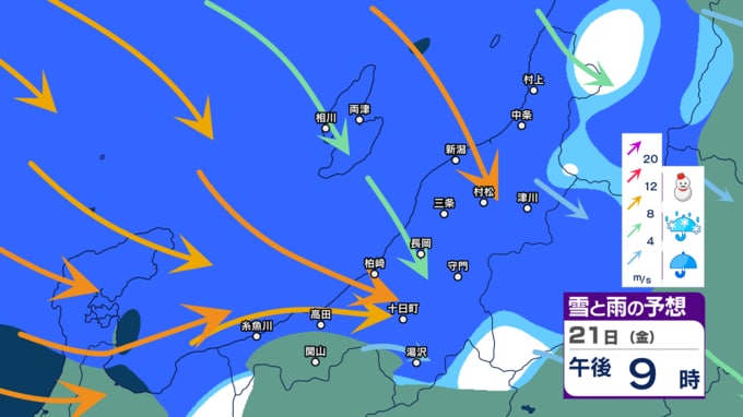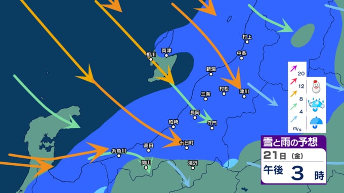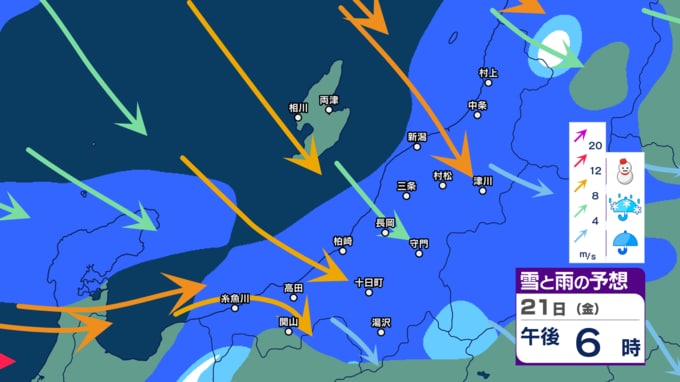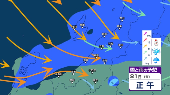 新潟県内はきょう21日夜遅くにかけて落雷や竜巻などの激しい突風、急な強い雨に注意【3時間ごとの雨雪と風のシミュレーション・21日正午更新】 新潟放送 2025年11月21日(金) 12:03 21日(金)の雨雪と風のシミュレーション