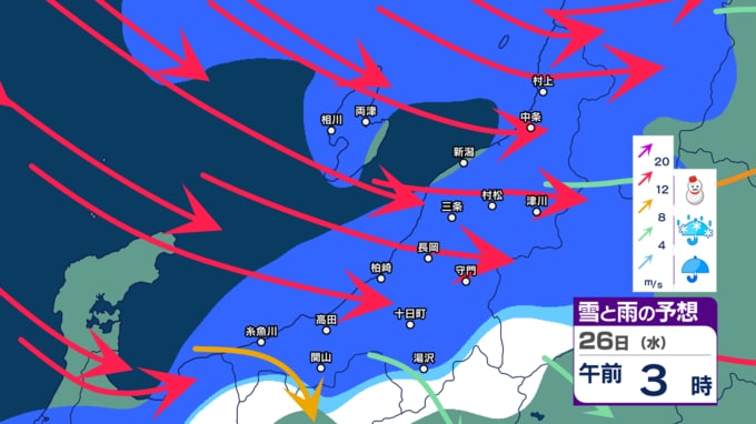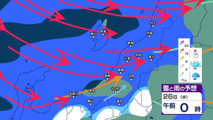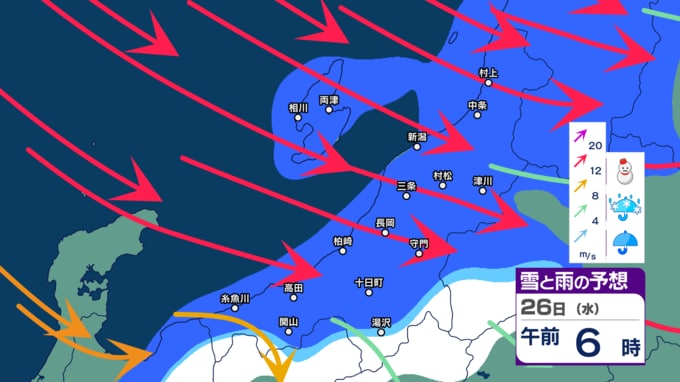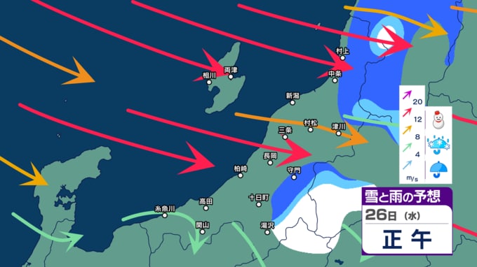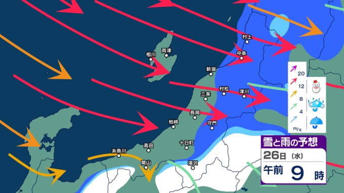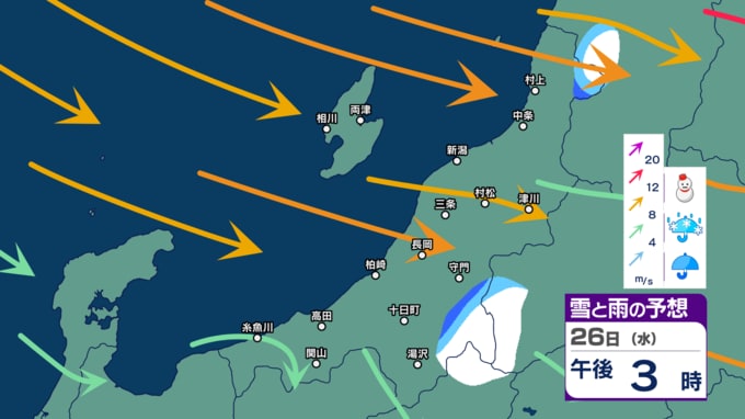 新潟県内はきょう21日夜遅くにかけて落雷や竜巻などの激しい突風、急な強い雨に注意【3時間ごとの雨雪と風のシミュレーション・21日正午更新】 新潟放送 2025年11月21日(金) 12:03 26日(水)の雨雪と風のシミュレーション(午後3時まで)
