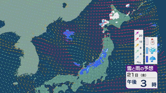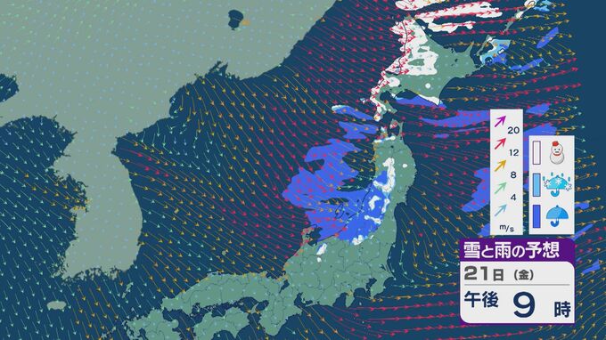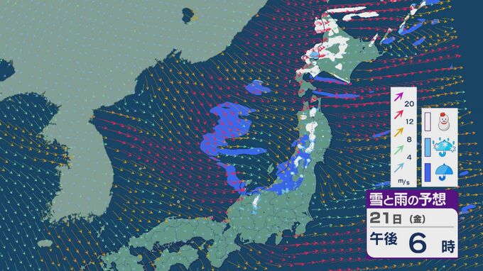 21日(金)は低気圧がオホーツク海に進み寒冷前線が北陸や東北などを通過 その後は西高東低の気圧配置に 急な強い雨やひょうに注意を 山地では雪の降る天気に 雨・雪と風シミュレーション 北陸放送 2025年11月21日(金) 12:49 国内 21日以降の雨・雪と風の予想ですが、夕方から夜にかけては北陸や東北の日本海側では雨や雪が降るところもありそうです。