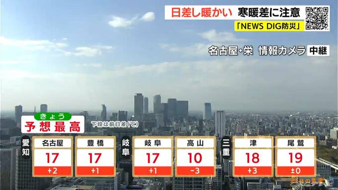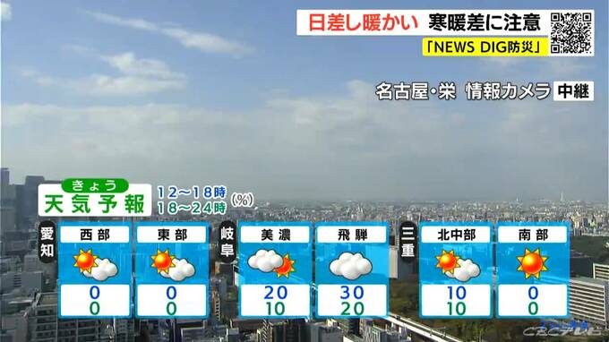 最高気温は津で18℃、名古屋や豊橋、岐阜で17℃、高山では10℃の予想です。平野部ではきのうより2℃ほど高くなる所が多いでしょう。昼と夜の寒暖差にはご注意ください。