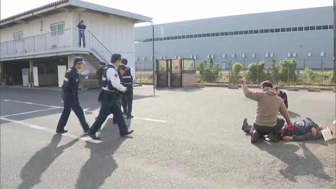 その後、不審者の目撃情報を受けて倉庫に隠れていた男を発見し、刺股などを使って取り押さえるまでの手順を確認しました。