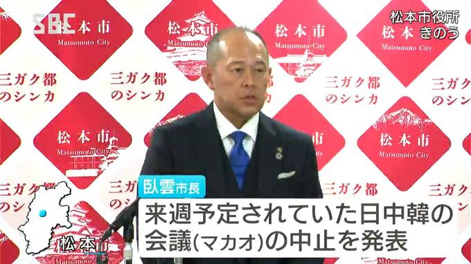 松本市の臥雲市長は21日の定例会見で、来週マカオで予定されていた3か国の会議が中止になったことを明らかにしました。