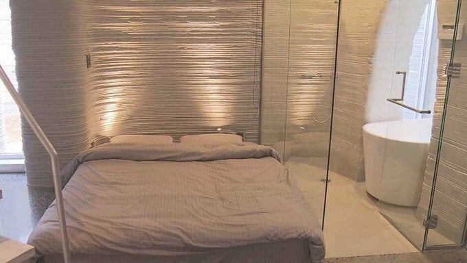 建設用に開発された立体を生成できる3Dプリンターで建築されたのです。中に入ってみると1階にはベッドルームやバスルームが、階段を上るとダイニングが広がり、外観と同様、シンプルながらモダンなデザインに仕上がっています。