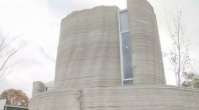 「こちらはモルタルで印刷をして3Dプリンターを使った住宅」