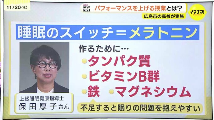 広島大学の林教授は、パフォーマンスをあげるために▽十分な睡眠時間の確保▽平日・休日問わず生活リズムを一定にすることが大切だと話します。