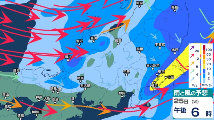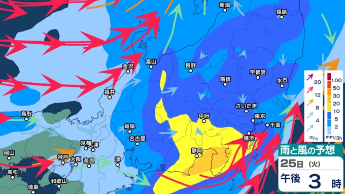 雨と風の予想シミュレーションをみてみると、24日(月・祝)午後から九州にかかっていた雨雲は、25日(火)夕方にかけて徐々に中国・四国→近畿→東海・北陸・甲信→関東の順に移動。25日夜~26日(水)明け方にかけては北海道・東北を中心に雨雲がかかる見込みです。26日は正午にかけて、北海道・東北・北陸といった日本海側を中心に雨雲がかかり続け、夜になるにつれて雨雲は離れていくとみられます。