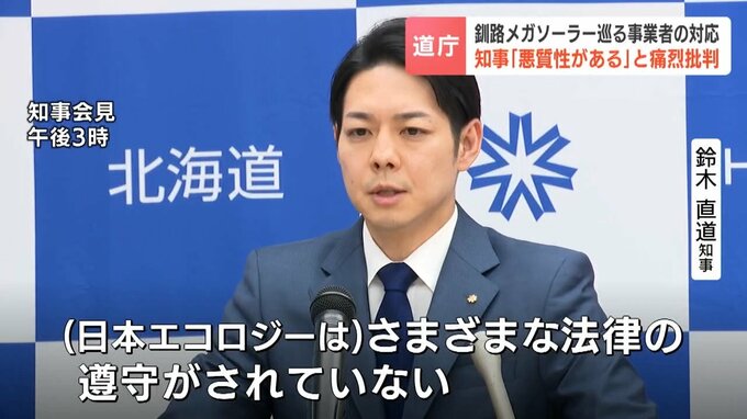 北海道の釧路湿原周辺のメガソーラー建設の問題で、鈴木知事は事業者の日本エコロジーの対応を「悪質性がある」と強く批判しました。