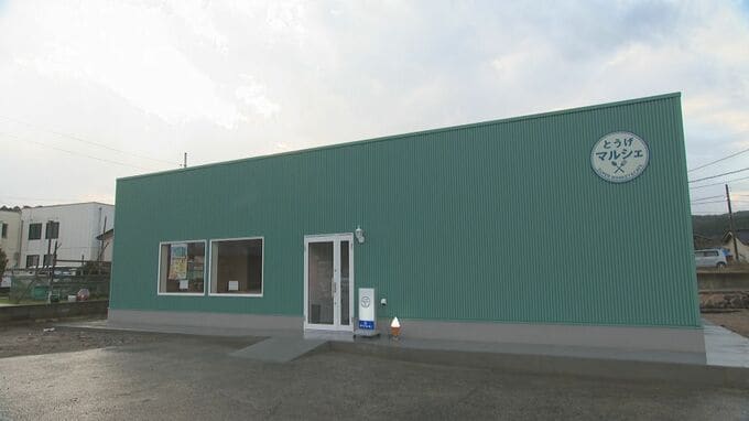 輪島市門前町の道下地区にオープンした「とうげマルシェ」は、スーパーとカフェを併設していて、地産地消をテーマに新鮮な野菜や海産物など地元の食材が並びます。