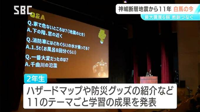 災害を学び、後世に伝える役割は、地元の子どもたちも担っています。村内のホールで開かれた白馬中学校の学習発表会。2年生は1年がかりで防災学習に取り組んでいます。