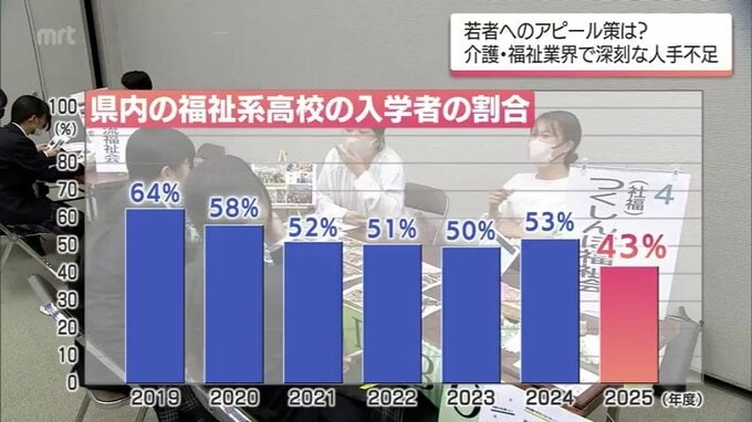 県内には、福祉について専門的に学べる高校が6校ありますが、ここ数年は募集定員の半数程度しか入学希望者が集まらず、今年度は43%まで落ち込んでいます。