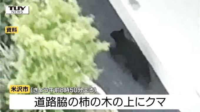 市によりますときょう午前8時50分ごろ米沢市芳泉町で住民がクマを目撃しました。クマは体長75センチで道路わきの柿の木に登っていたということです。