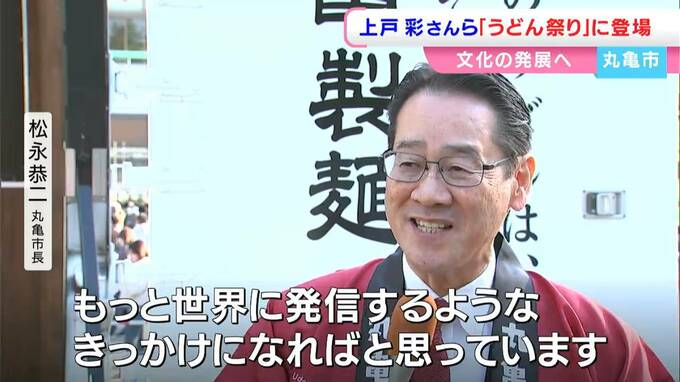 丸亀城の芝生広場で開かれたイベントです。丸亀製麺のアンバサダー、上戸彩さんも登場。集まった人たちを沸かせました。丸亀製麺の創業25周年と丸亀市政20周年を記念して初めて開かれたもので、讃岐うどんを味わい新たな魅力を発見できるさまざまな趣向が凝らされました。