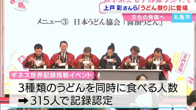 きょう(21日)は、上戸さんに俳優の松岡昌宏さんを加えて、地域の中学生らと「3種類のうどんを同時に食べる人数」のギネス世界記録にも挑戦しました。