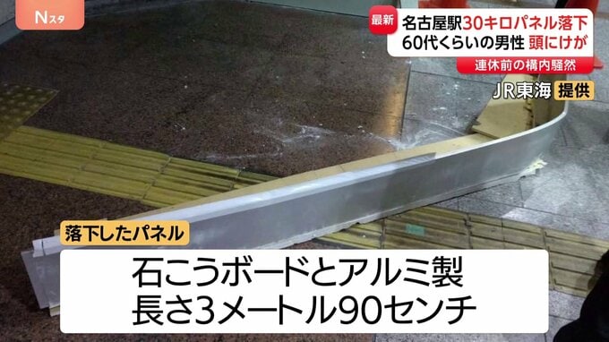 3連休前の名古屋駅が一時騒然。重さ30キロのパネルが天井から落ちて、男性が頭にけがをしました。きょう午後2時過ぎ、JR名古屋駅の中央コンコースで、「けがをした人がいる」と119番通報がありました。エレベータ…