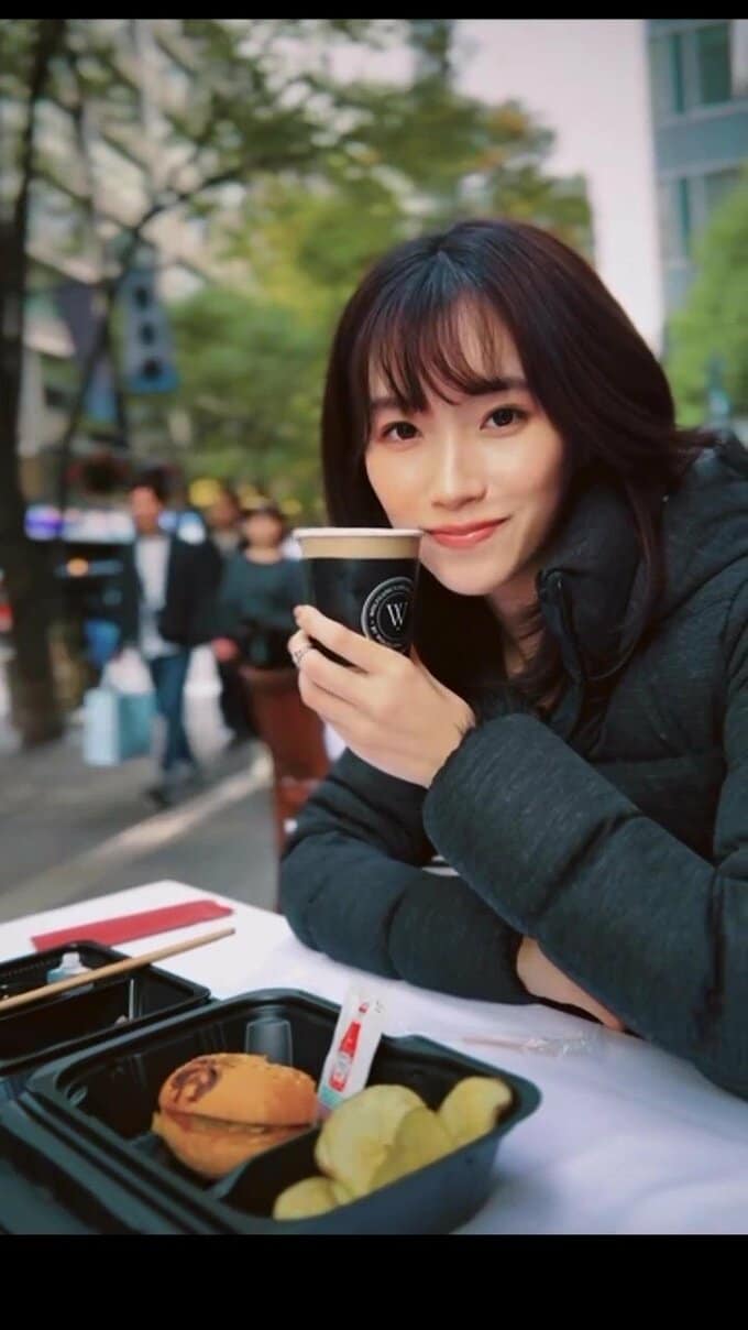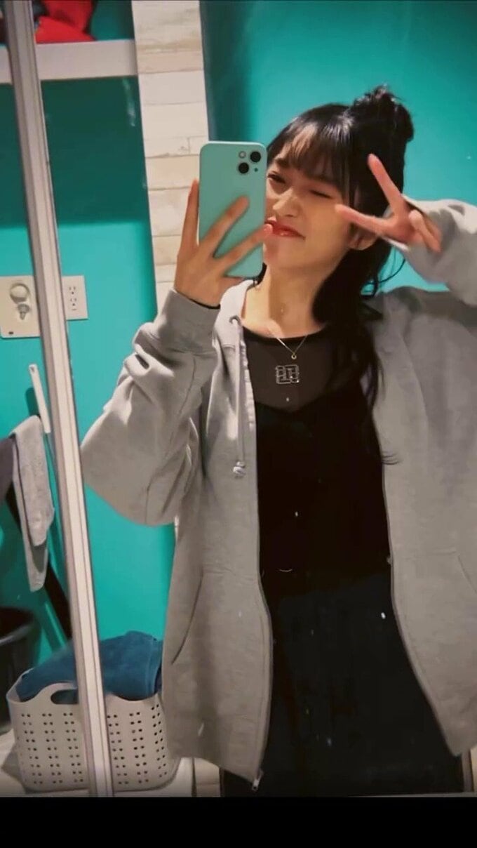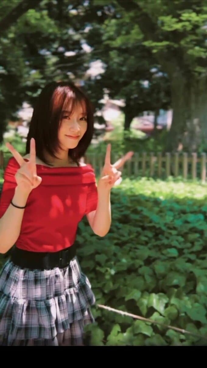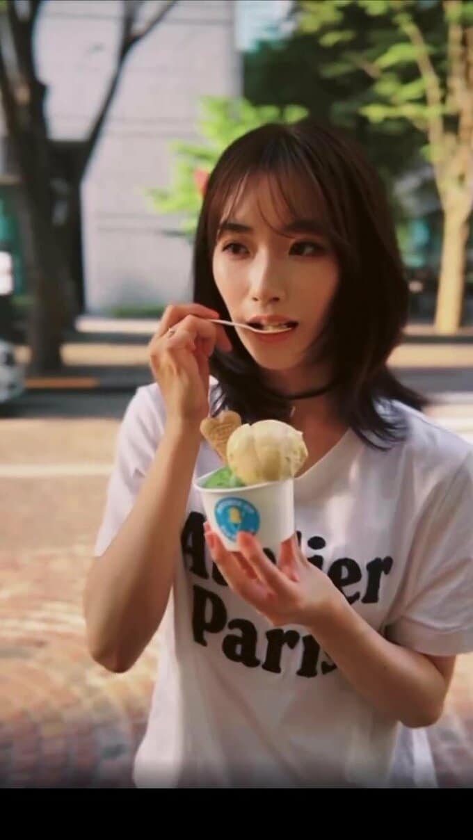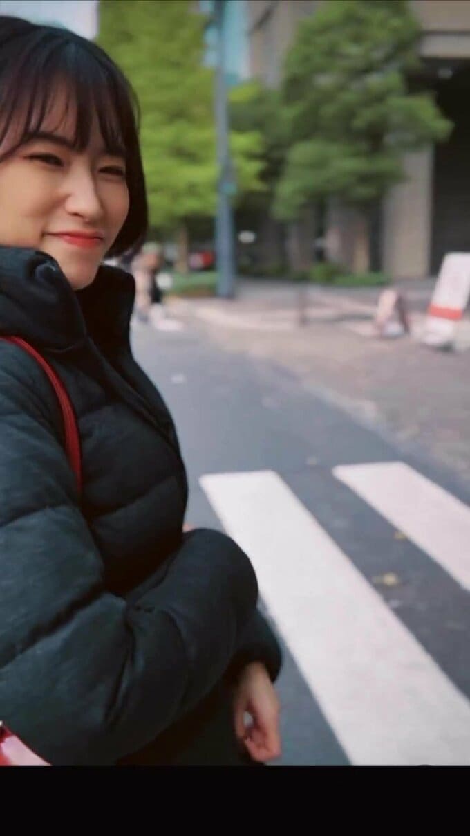 その後は、赤の半袖ブラウスにグレーのチェックのミニで夏の木漏れ日の中を歩くカットや、グレーのパーカーをラフに着て鏡に向かって自撮りしたり、ダウンジャケットで横断歩道を闊歩したり、半袖Tシャツでアイスクリームを食べたりと、順番も関係なく様々なカットをBGMのビートに乗せてつないでいます。