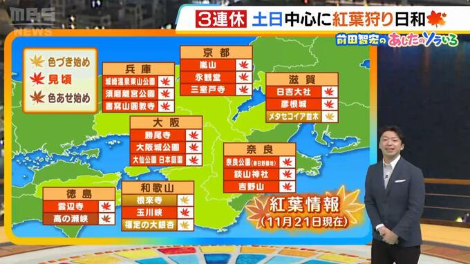 11月22日(土)の近畿地方は、紅葉狩り日和。3連休は晴天でスタートという所が多くなりそうです。 西から移動性の高気圧に覆われ、中部や南部は一日を通して概ね晴れるでしょう。北部は寒気の影響で午前を中…