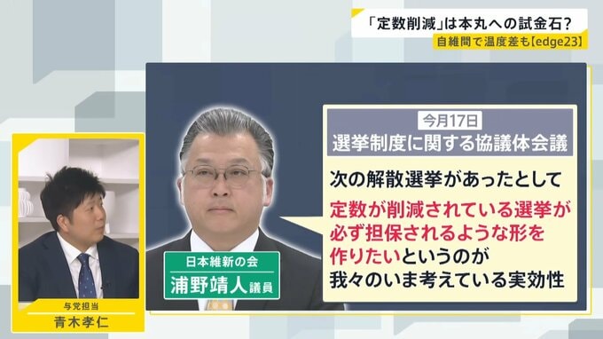 維新側の本音はどこにあるのか。選挙制度改革の協議を担当する浦野靖人議員は「次の解散選挙があったとして、そこで定数が削減されている選挙が必ず担保されるような形を作りたい」と発言。支持率82%の高い内閣支持率を背景に早期解散の可能性も取り沙汰される中、維新としては政策実現の担保を取りたいという思惑が透ける。