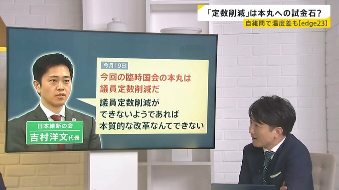 「今回の臨時国会の本丸は議員定数削減だ。議員定数削減ができないようであれば、本質的な改革なんてできない」と語る維新の吉村洋文代表。連立後の各党協議で維新側は比例定数を50削減する方向を示したが、自民党内でも一部からは「性急すぎる」「丁寧な議論が必要」との声も出ている。