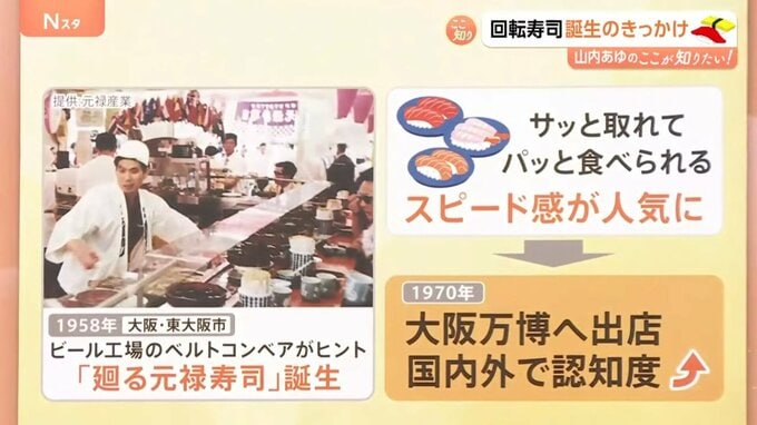 白石さんは元々、立ち食いのお寿司屋さんを営んでいましたが、ビール工場のベルトコンベアをヒントに、1958年 大阪・東大阪市に『廻る元禄寿司』をオープンしたということです。