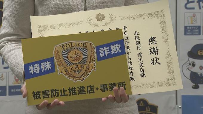 滑川警察署によりますと、北陸銀行滑川支店が未然に詐欺被害を防いだ回数は、これで通算5回目と6回目となり、支店には、金色の「特殊詐欺被害防止推進店・事業所」の認定プレートが贈られました。