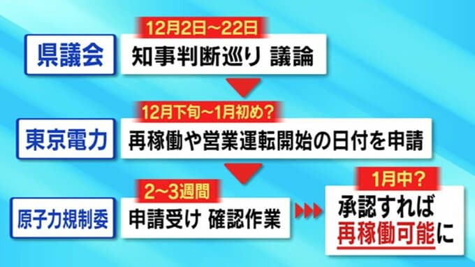 これまでの前例では確認には2週間から3週間ほどかかり、早ければ1月中にも柏崎刈羽原発の再稼働が可能となります。